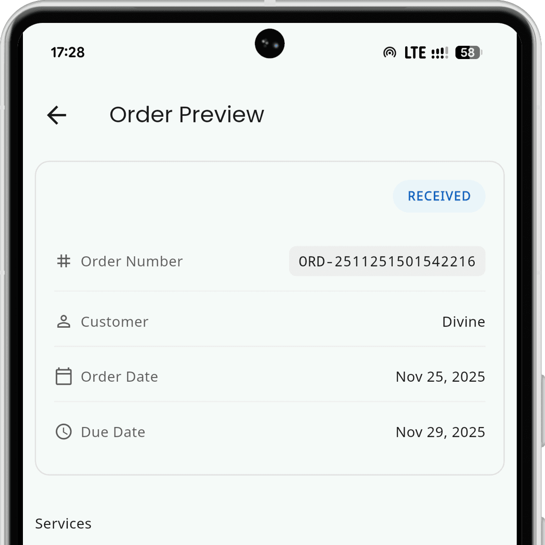 See all your orders in one place. Track progress from 'New' to 'Completed', set deadlines, and never miss a detail. Your digital order book, always in your pocket.